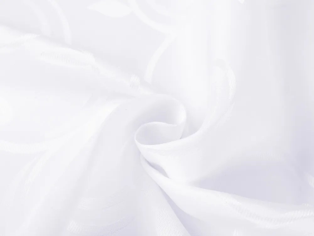 Teflónový behúň na jedálenský stôl s vytkávaným vzorom bielych ornamentov s lístkami, vyrobený zo 100% polyesterovej látky s vodoodpudivou a nešpinivou teflónovou úpravou. Luxusný vzhľad. Je stálofarebný, nezráža sa a veľmi ľahko sa udržuje. Okraje behúňa sú zatavené do tvaru malých oblúčikov - viď. detailné foto, na želanie môžeme obšíť klasickým rovným stehom. Dekoračné behúne sú praktickým doplnkom interiéru Vášho domu, bytu, chalupy a sú vhodné aj do hotelov a reštaurácií. Odporúčaný presah (previs) behúňa je cca 20-30 cm na každej strane stola, tzn. ak máte stôl dlhý napr. 100 cm, objednajte behúň s dĺžkou 140 až 160 cm. Šijeme v našich krajčírskych dielňach v ČR, ponúkame aj rozmery na mieru.