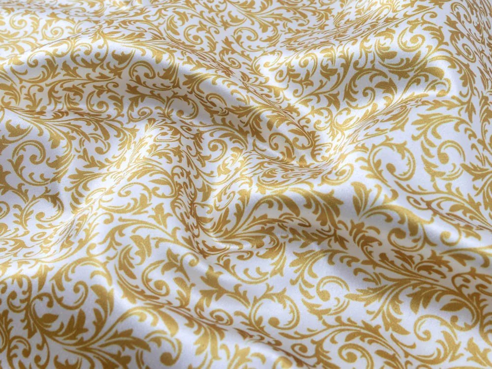 Dekoračný saténový behúň na jedálenský stôl s digitálnou tlačou, so vzorom drobného zlatého zámockého vzoru na krémovo bielom podklade, ušitý zo 100% polyesterovej látky Satén LUX s gramážou 160 g/m2. Behúne dodávame kompletne obšité. Jednostranné prevedenie - rubová strana je biela bez vzoru. Dekoračné behúne sú praktickým doplnkom interiéru Vášho domu, bytu, chalupy a sú vhodné aj do hotelov a reštaurácií. Odporúčaný presah (previs) behúňa je cca 20-30 cm na každej strane stola, tzn. ak máte stôl dlhý napr. 100 cm, objednajte behúň s dĺžkou 140 až 160 cm. Šijeme v našich krajčírskych dielňach v ČR, ponúkame aj rozmery na mieru.