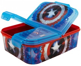 Detský desiatový multibox Kapitán Amerika - MARVEL s tromi priehradkami. Odolná krabička na desiatu ideálna do školy aj na cesty a výlety. Veko je čiastočne priehľadné pre ľahší prehľad o obsahu boxu a zdobí ho obrázky s motívom Captain America, najmä symboly jeho štítu. Táto dóza na jedlo, alebo na iné drobné predmety je vhodná pre deti od 3 rokov a nie je vhodná do umývačky riadu, ani do mikrovlnnej rúry. Je vyrobená zo zdravotne nezávadného materiálu bez obsahu BPA. Na čistenie nepoužívajte abrazíva ani detergenty. Rozmery tohto boxu na desiatu sú cca 19,5 x 16,5 x 6,7 cm, jeho hmotnosť je 150 gr. TIP • Ak si aj Vy, alebo Vaše dieťa obľúbili komiksy a filmy o superhrdinoch, prezrite si celú našu ponuku produktov s motívom Filmoví hrdinovia .