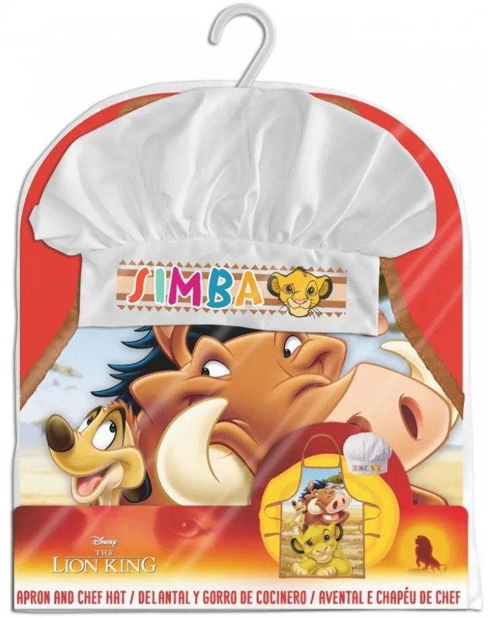 Set detskej zástery a kuchárske čiapky Leví kráľ - Simba . Zástera je vhodná pre malých kuchárov, ale aj do výtvarnej výchovy, do keramiky, či ako pracovná zástera k rôznym školským aj mimoškolským pracovným činnostiam. Tento kuchársky set je vhodný pre deti 3 – 8 rokov. Výška zástery je cca 52 cm, jej šírka je cca 42 cm. Všetko je možné prať pri teplote do 60°C.