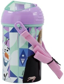 Detská fľaša na pitie s motívom Ľadové kráľovstvo - Frozen . Je vybavená praktickým viečkom, ktoré je možné ľahko otvoriť stlačením tlačidla. Po otvorení sa automaticky vysunie slamka, ktorá po zatvorení zostáva čistá vďaka ochrannému viečku. Fľaša je ideálna do školy, na tréningy alebo na výlety. Je vyrobená zo zdravotne nezávadného materiálu bez BPA. Nie je vhodná do umývačky ani do mikrovlnnej rúry. Na čistenie nepoužívajte abrazívne prostriedky ani detergenty. Pred prvým použitím umyte fľašu teplou vodou a saponátom. V prípade poškodenia, najmä perforácie slamky, fľašu nepoužívajte. Fľaša je vhodná pre deti od 3 rokov. Jej objemom je 450 ml. TIP • Ak si aj vaše dievčatko obľúbilo príbehy princezien Anny a Elsy a ich kamarátov, prezrite si celú našu ponuku produktov s motívom Frozen .