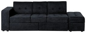 Táto rozkladacia pohovka je ideálna do menších interiérov a predstavuje pohodlie a univerzálnosť. Skladá sa z dvojmiestnej pohovky, taburetky so skrytým úložným priestorom a dvoch priestranných zásuviek pod sedadlom pohovky. Je možné rozložiť ju na pohodlnú posteľ. Posteľnú bielizeň možno jednoducho odložiť do zásuviek pod sedadlom. Sklopné operadlo a sklopný podnos s držiakom na pohár sa postarajú o úžasný komfort. Pohovku môžete rozšíriť samostatnou taburetkou. Táto pohovka s čistými líniami, minimalistickým prešívaním s gombíkmi a malými nohami zo syntetického materiálu je ideálna do každého moderného interiéru.
