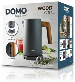 Nový ucelený rad WOOD YOU sú veľmi moderne spracované spotrebiče s kovovým/plechovým telom striekaným do matnej sivej farby a doplnkami v drevenom dekore. Drevo a sivá farba pôsobia veľmi luxusne s nádychom rustikálneho šarmu, preto neváhajte a pozrite sa aj na ostatné spotrebiče DOMO – WOOD YOU.Rýchlovarnú kanvicu používa každá domácnosť niekoľkokrát za deň, preto dbajte na správny výber s vysokým bezpečnostným štandardom. Vďaka 360-stupňovej otočnej základni sa ľahko používa, a to ako pre pravákov, tak pre ľavákov. Patentovaný bezpečnostný systém Otter vždy včas vypne pri dosiahnutí varu, sňatí z podstavca, alebo aj pri spustení naprázdno bez vody.Bezpečnostné prvky: automatické vypnutie pri vare nehrdz. výlevka vrátane nehrdz. vyberateľného filtra automatické vypnutie pri sňatí kanvice z podstavca patentovaný bezpečnostný 360° konektor Otter® patentovaný termostat Otter® ochrana proti varu bez vody gumové protišmykové nožičky na podstavciOstatné vlastnosti: podsvietený vypínač pomocou bielej diódy vo vypínači rovné nehrdz. dno so skrytou špirálou otváranie: stlačením tlačidla uprostred veka vyberateľné nehrdz. sitko (filter) vo výlevke zachytávajúce nečistoty podstavec s priestorom na zmotanie prívodného kábla