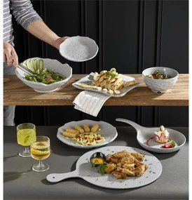 Žulová okrúhla doska z melamínu v sivej farbe. Priemer dosky: 35 cm Dĺžka dosky: 48 cm Výhody melamínových výrobkov: 1) veľmi praktické, na použitie v gastronómii a v domácnosti/záhrade 2) odolnejšie ako porcelán/keramika 3) vhodné do umývačky riadu 4) vyrobené z materiálov, ktoré neobsahujú žiadne škodlivé látky 5) zdravé, šetrné k životnému prostrediu, bez plastov 6) vyrobené s maximálnym dôrazom na detail 7) veľmi moderné, pekné vzory