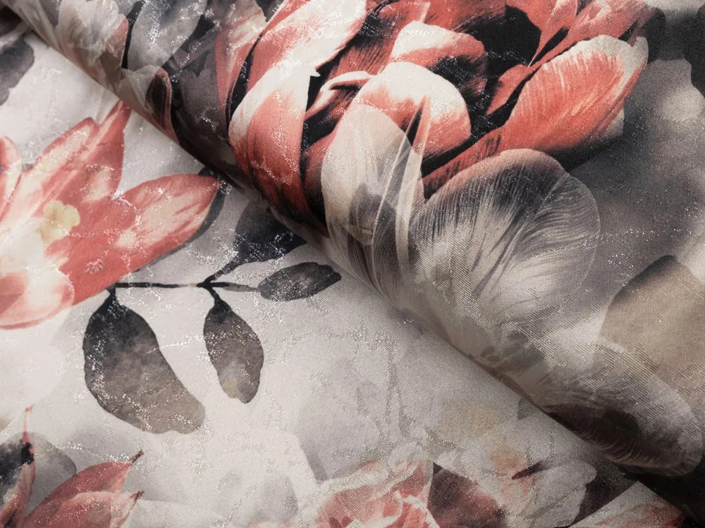 Dekoračný behúň na jedálenský stôl, vyrobený z luxusnej žakárovo tkanej dekoračnej látky Parma, s digitálne tlačeným vzorom veľkých tehlovo červených kvetov na dymovo sivohnedom podklade. Podkladová látka je vyrobená zo 100% polyesteru s gramážou 180 g/m2, striebristo vytkávaná do nepravidelných vzorov s efektnými odleskami. Jednostranné prevedenie. Dekoračné behúne sú praktickým doplnkom interiéru Vášho domu, bytu, chalupy a sú vhodné aj do hotelov a reštaurácií. Sú stálofarebné, nekrčivé a jednoduché na údržbu. Odporúčaný presah (previs) behúňa je cca 20-30 cm na každej strane stola, tzn. ak máte stôl dlhý napr. 100 cm, objednajte behúň s dĺžkou 140 až 160 cm. Šijeme v našich krajčírskych dielňach v ČR, ponúkame aj rozmery na mieru.