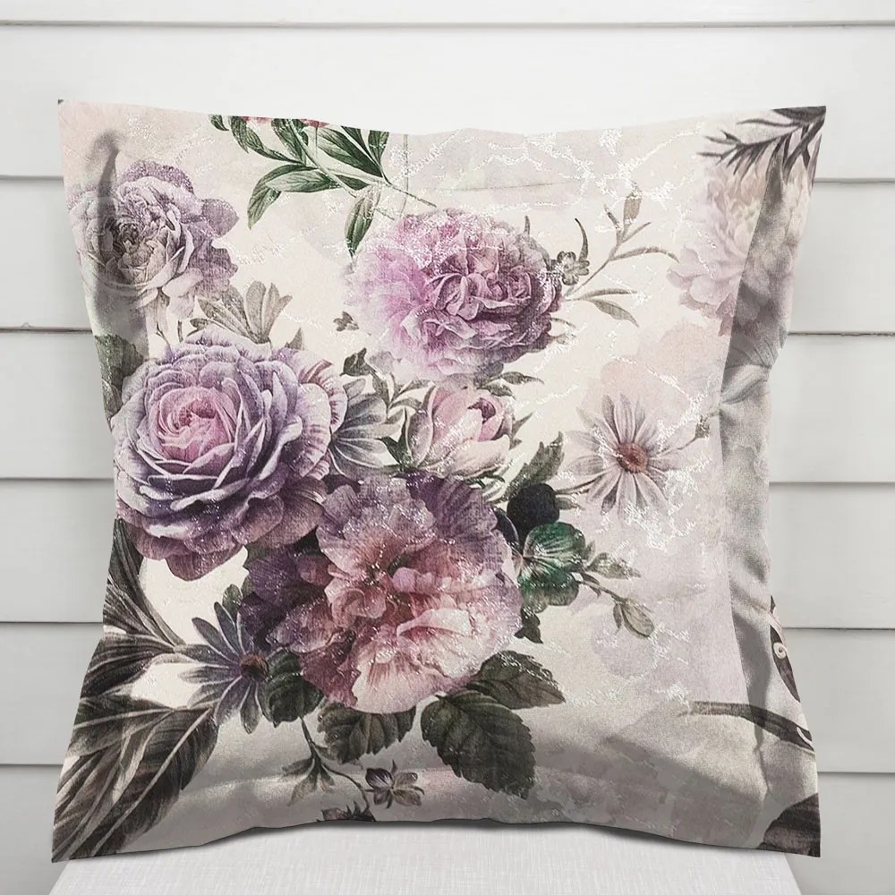 Dekoračná obliečka na vankúš s ozdobným lemom, vyrobená z luxusnej žakárovo tkanej dekoračnej látky Parma, s digitálne tlačeným vzorom starofialových kvetov a zelených listov na smotanovom podklade. Podkladová látka je vyrobená zo 100% polyesteru s gramážou 180 g/m2, striebristo vytkávaná do nepravidelných vzorov s efektnými odleskami.Zapínanie na zips je skryté na spodnej strane obliečky a neruší tak jej celkový vzhľad. Uvedený rozmer je rozmer vnútorného priestoru pre výplňový vankúšik, ozdobný lem má šírku cca 4 cm na každej strane. K obliečkam na vankúše ponúkame aj výplňové vankúše. Šijeme v našich krajčírskych dielňach v ČR, ponúkame aj rozmery na mieru.