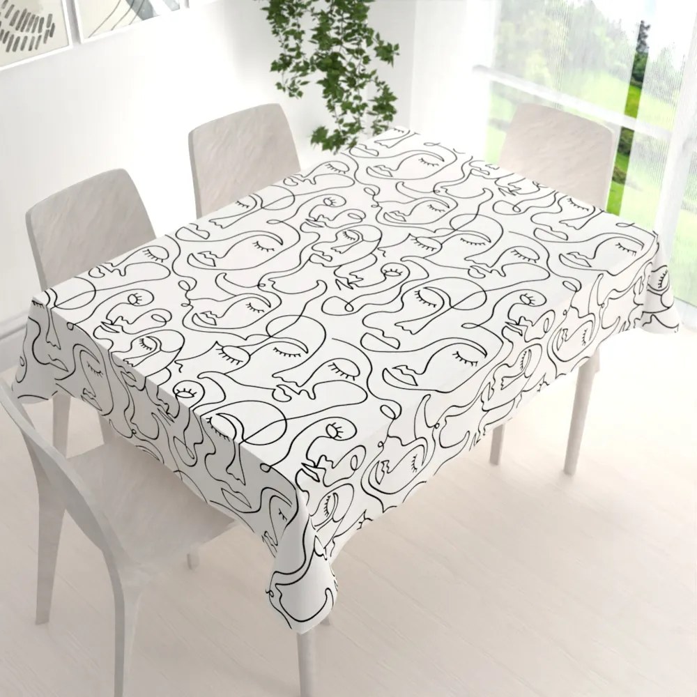 Bavlnený obdĺžnikový dekoračný obrus na stôl so vzorom čiernych abstraktných tvári na bielom podklade. Je ušitý z husto tkaného 100% bavlneného plátna s certifikátom zdravotnej nezávadnosti Oeko-Tex 100. Obrus dodávame kompletne obšitý. Dekoračné obrusy Sandra sú praktickým doplnkom interiéru Vášho domu, bytu, chalupy a sú vhodné aj do hotelov a reštaurácií. Ako správne zvoliť rozmer obrusu? Uvedené rozmery sú rozmery obrusu, nie stola. Bežný doporučený presah obrusu je cca 20-30 cm na každú stranu stola, tzn. ak máte stôl s rozmerom napr. 60x100 cm, objednávajte obrus s rozmerom 100x140 cm až 120x160 cm, vždy však s prihliadnutím na vlastné individuálne požiadavky. Šijeme v našich krajčírskych dielňach v ČR, ponúkame aj rozmery na mieru.