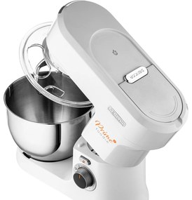 Tento kuchynský robot je ideálnou voľbou pre všetkých, ktorí potrebujú robustný a výkonný prístroj na prípravu rôznych druhov cesta, šľahanie alebo mletie surovín. Má silný motor s výkonom 1 000 W, ktorý zabezpečuje efektívnu prácu pri všetkých typoch prípravy jedál. S 4,5 l nerezovou nádobou je dostatočne veľký na prípravu rôznych ciest, a to až 0,8 kg tuhých ciest alebo 2,2 l jemných ciest. Ponúka 6 nastavení rýchlosti, funkciu PULSE pre krátkodobý maximálny výkon a dva programy NutriSmart pre efektívne spracovanie potravín. Unikátne LED osvetlenie umožňuje ľahkú kontrolu konzistencie cesta, čo vám pomôže dosiahnuť perfektné výsledky.Robot je vybavený 4 nástavcami na miesenie a šľahanie, vrátane FLEXI šľahača a FLEXI metly, ktoré sú špeciálne navrhnuté pre jemné cestá a krémy. Unikátne magnetické viečka zaisťujú bezpečné a jednoduché používanie počas prípravy. Okrem toho robot obsahuje mixér s 1,5 l sklenenou nádobou a titánom potiahnutým ostrím, čo zaručuje dlhú životnosť a jednoduché sekanie alebo miešanie potravín. Súčasťou je aj mlynček na mäso s nástavcami na hrubé a jemné mletie a plnenie klobás, čo uľahčuje prípravu domáceho mletého mäsa. Na prípravu cukroviniek je k dispozícii formovač na cukrovinky.Tento kuchynský robot ponúka široké možnosti na prípravu všetkých druhov jedál a vďaka rôznym funkciám a príslušenstvu je ideálny pre domáce kuchyne, kde sa využíva na maximum.