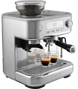 Sencor SES 6050SS je pákový espresso kávovar, ktorý prináša do vašej kuchyne kvalitnú a profesionálnu prípravu kávy s integrovaným mlynčekom. Tento model je vybavený kónickým mlynčekom s kovovými mlecími kameňmi, ktoré zaručujú presné mletie a dlhú životnosť, a ponúka 15 nastavení hrubosti mletia, čo vám umožní dosiahnuť tej najlepšej extrakcie arómu podľa vašich preferencií. Automatický senzor mletia zaisťuje dávkovanie presného množstva kávy priamo do páky, čo vám umožňuje dosiahnuť ideálnu prípravu kávy bez námahy. LCD displej umožňuje jednoduché nastavenie a ovládanie kávovaru, zatiaľ čo 3 automatické programy (Espresso, 2x Espresso, para/horúca voda) a nastaviteľné množstvo vody poskytujú dokonalú flexibilitu. Bojlerový systém ohrevu s termoblokom a nehrdz. potrubím zaisťuje dokonalú kontrolu teploty vody, čo je kľúčové pre správnu prípravu espressa. Švajčiarsky prietokomer zaisťuje presné dávkovanie vody s vysokou precíznosťou, zatiaľ čo funkcia predsparenia podporuje kvalitnú extrakciu kávy. Kávovar je vybavený otočnou parnou tryskou, ktorá uľahčuje prípravu zamatovej mikropeny pre cappuccino alebo latté. S profesionálnym talianskym čerpadlom s tlakom 15 barov vám kávovar poskytne kávu v pravom talianskom štýle. K dispozícii máte filtre z nehrdz. ocele pre 1 alebo 2 šálky, čo vám dáva viac možností na dávkovanie mletej kávy. Funkcia pary / horúcej vody umožňuje jednoduchú prípravu mliečnej peny alebo čaju. Veľká doska na ohrev šálok s úložným priestorom pre vtláčadlo zaistí, že vaša káva bude vždy podávaná v správnej teplote, a môžete ohriať niekoľko šálok alebo veľký hrnček. Súčasťou príslušenstva je nehrdz. kanvička na mlieko, ktorá je ideálna na prípravu klasického cappuccina aj latté art. Profesionálna 58 mm páka (portafilter) a odnímateľná odkvapkávacia miska pre ľahké čistenie s úložným priestorom pre príslušenstvo dodávajú kávovaru praktický dizajn a jednoduché ovládanie. Zásobník na 250 gramov zrnkovej kávy a zásobník na vodu s objemom 2,3 litra poskytujú dostatok priestoru na prípravu viacerých šálok naraz. Kontrolka potreby odvápnenia pomáha udržať kávovar v dobrom stave a predlžuje jeho životnosť. Tento elegantný kávovar v nerezovom prevedení je ideálny pre každého, kto hľadá kvalitný a profesionálny kávovar s kompletným príslušenstvom. Príslušenstvo: držiak filtra - páka odmerka 2 filtre (pre 1 a 2 šálky) kanvička na mlieko čistiaca sada tamper - vtláčadlo Technický popis príkon: 1480-1770 W napájanie: 220-240 V / 50-60 Hz obsah nádoby na kávu: 250 g obsah nádrže na vodu: 2,3 l hlučnosť: 75 dB (A)