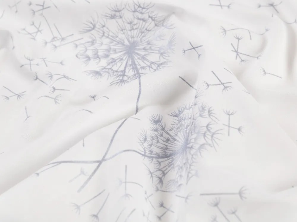 Dekoračný záves z ľahkej, vzdušnej a priesvitnejšej dekoračnej polyesterovej látky so striebrotlačou jesenných púpav na bielom podklade. Jemný lesk materiálu dáva látke elegantný "saténový" vzhľad. Jednostranná tlač, tlačený vzor však presvitá aj na rubovú stranu. Záves je určený predovšetkým na dekoračné účely a pre zatienenie miestnosti, nie však pre jej úplné zatemnenie. Záves dodávame kompletne obšitý, s našitou univerzálnou riasiacou stuhou RS-005 (š. 5 cm), ktorá je vhodná pre uchytenie na klasické žabky alebo závesné háčiky. Až doma sa tak môžete rozhodnúť, či si záves nariasíte – viď. detailná fotografia, alebo riasenie nevyužijete a necháte si záves rovný v plnej šírke (dľžke). Nariasenie je veľmi jednoduché – stačí zatiahnúť za sťahovacie šnúrky na konci závesu. Nariasením dôjde ku skráteniu šírky závesu zhruba na polovicu, v závislosti na zvolenej hustote riasenia, výška závesu zostáva rovnaká. Cena je za 1 kus závesu. Ak potrebujete záves na obidve strany okna, objednajte 2 kusy. Uvedené rozmery variantov sú rozmery v roztiahnutom (nenariasenom) stave. Háčiky a žabky na zavesenie nie sú súčasťou závesu. Nevyhovuje Vám ani jeden z nami ponúkaných rozmerov alebo spôsobov uchytenia závesu? Radi Vám ušijeme záves podľa Vašich predstáv a presne na mieru Vášho okna. Šijeme v našich krajčírskych dielňach v ČR.