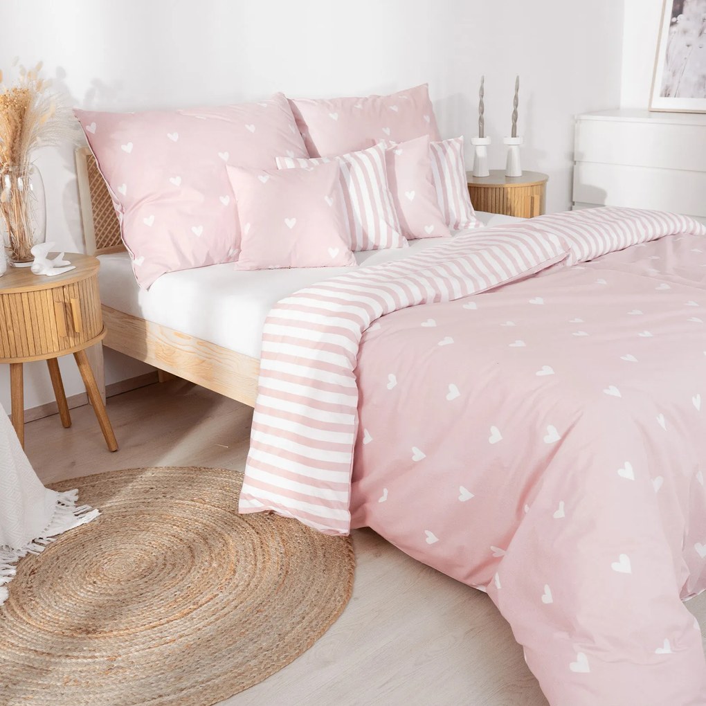 Láska je vo vzduchu a čoskoro môže byť aj vo vašej spálni! Zamilujte sa do romantického motívu bielych srdiečok na púdrovo ružovom podklade a vytvorte si v spálni harmonickú atmosféru. Posteľné obliečky sú ušité zo 100% hladkej bavlny (145 g/m²), ktorá je prirodzene priedušná, jemná na dotyk a poskytne vám maximálny komfort po celú noc.. Ušité s láskou našimi šičkami Každé posteľné obliečky prejdú rukami našich skúsených šičiek, ktoré ich pre vás starostlivo nastrihajú a ušijú priamo v Českej republike. Rozmery šité na mieru zadávame do výroby hneď na druhý deň po objednaní, aby ste si nový kúsok mohli užiť čo najskôr. Jednoduché zapínanie na zips Posteľné obliečky sú vybavené praktickým zapínaním na zips, vďaka ktorému bude prezliekanie periny a vankúša otázkou chvíľky. Zips je navyše schovaný v leme, takže pri spaní nie je vidieť ani cítiť.