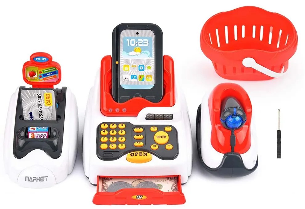 Herná pokladňa s realistickými zvukovými a svetelnými efektmi ponúka deťom zábavnú možnosť zapojiť sa do rolových hier. Ideálna na to, aby si deti hravou formou osvojili základy manipulácie s peniazmi, počítania a rozvíjali svoju kreativitu. Súčasťou balenia sú doplnky ako hračkárske bankovky, mince a platobné karty, ktoré ešte viac obohatia zážitok z nakupovania. Realistická pokladňa so zvukovými a svetelnými efektmiHerná pokladňa ponúka autentické zvukové a svetelné efekty, ktoré robia hru ešte pútavejšou. Interaktívne prvky, ako čítačka kariet, overovač bankoviek a funkčná pokladňa, zaručene zabavia deti na dlhé hodiny.Vzdelávacie a zábavné rolové hryPokladňa umožňuje deťom prehrať si proces nakupovania, čím podporuje rozvoj ich počítacích, komunikačných a sociálnych zručností. Tento typ hry je mimoriadne užitočný pre deti v predškolskom veku, ktoré sa práve zoznamujú so svetom čísel.Praktické a zábavné doplnkySúčasťou balenia je všetko potrebné pre realistický zážitok z nakupovania: hračkárske bankovky, mince, platobné karty, čítačka kariet a pokladňa s váhou. Deti si môžu vyskúšať rôzne role, či už ako pokladník alebo zákazník.Červeno-biela hračkárska pokladňa:Rozmery výrobku: 28 x 14 x 15 cmHmotnosť výrobku: 0,7 kgRozmery balenia: 43,5 x 20,5 x 17 cmHmotnosť balenia: 1 kgObsah balenia:-1 pokladňa-1 čítačka kariet-1 PDA-1 skener-5 potravín (kukurica, hrozno, paprika, hruška, zemiak)-1 nákupný kôš-1 mlieko-1 pomarančový džús-1 snack-1 pistácie-6 bankoviek-1 banková kartaModrofialová pokladňa:Veľkosť balenia: 29x13,5x16 cmVeľkosť balenia: 0,6 kgVeľkosť výrobku: 0,37 kg- 1 modrá banková karta- 1 ružová banková karta- 5 mincí- 4 bankovky- 1 pokladňa s váhou- 1 čítačkaHračka sa neodporúča pre deti do 3 rokov!Napájanie na 4 batérie AA, ktoré nie sú súčasťou balenia.