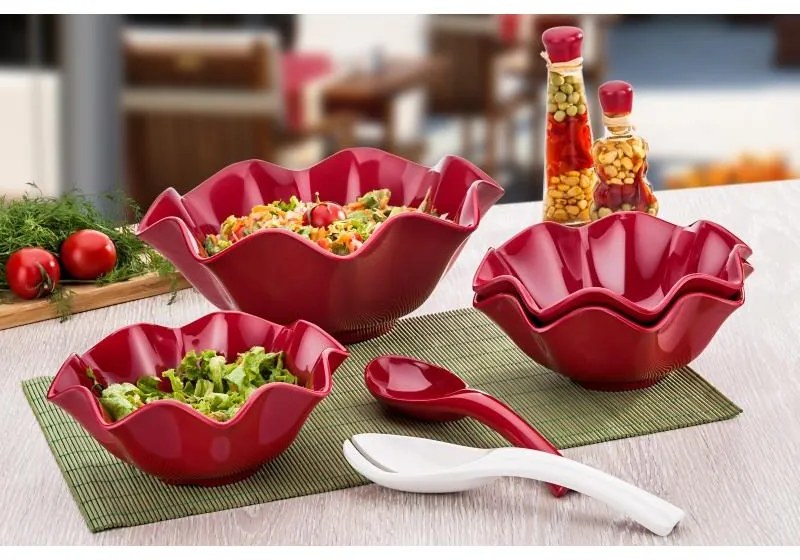 Melamínové riady na domáce a profesionálne použitie. Je odolný voči rozbitiu, bezpečný a hygienický a zároveň veľmi praktický a estetický. Výrobky sú vhodné do umývačky riadu. Šalátová súprava v červenej farbe obsahuje:1 x 28 cm misa3 x 20 cm miska1 x lyžica1 x vidlička - biela Kolekcia: ROST Výhody melamínových výrobkov: 1) veľmi praktické, na použitie v gastronómii a v domácnosti/záhrade 2) odolnejšie ako porcelán/keramika 3) vhodné do umývačky riadu 4) vyrobené z materiálov, ktoré neobsahujú žiadne škodlivé látky 5) zdravé, šetrné k životnému prostrediu, bez plastov 6) vyrobené s maximálnym dôrazom na detail 7) veľmi moderné, pekné vzory