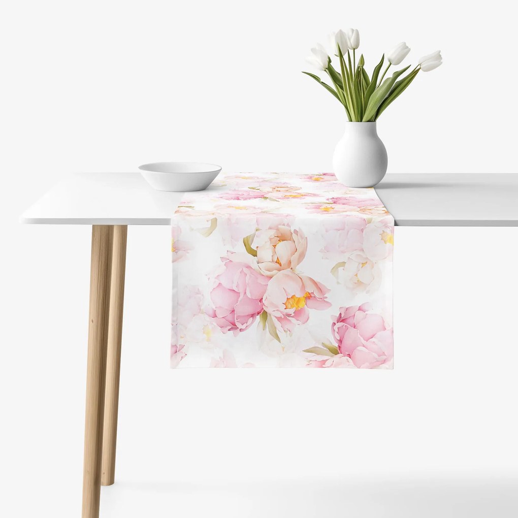 Kvalitný bavlnený behúň na stôl s motívom ružových kvitnúcich pivoniek na bielom podklade. Je ušitý z veľmi kvalitnej 100% bavlny o gramáži 145g/m2. Po celom obvode je behúň olemovaný. Je veľmi praktickým a moderným doplnkom jedálenského či konferenčného stola. Tento bavlnený behúň so vzorom kvitnúcich pivoniek ponúkame v šírke 20, 35 a 50 cm a v dĺžke 120, 140, 160, 180 cm. Pokiaľ Vám požadovaný rozmer chýba, zvoľte si variantu "Ušitie na mieru" a zadajte vlastné rozmery. Krajčírky potom behúň ušijú na mieru podľa Vášho želania. Jedná sa o kvalitný český výrobok s kvetinovým motívom, ktorý zakúpite iba v našom internetovom obchode.