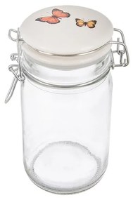 Sklenená dóza s pevným klipovým uzáverom a zdobeným keramickým viečkom s motívom motýľov sa skvele hodí na uchovávanie a servírovanie suchých, sušených alebo nakladaných potravín, džemov, sladkostí, nátierok, paštét a pod. Perfektne ozdobí jarnú kuchyňu. Viečko je opatrené silikónovým tesnením. Potraviny sú vďaka silikónovému tesneniu bezpečne chránené pred vonkajšími vplyvmi a ich aróma zostáva uzavretá vo vnútri nádoby. V našej ponuke nájdete aj ďalšie výrobky z kolekcie JAR. Materiál: sklo, keramika, kov, silikón Rozmery: ⌀ 6,5 cm, v. 12,5 cm Objem: 0,25 l Vhodné do umývačky riadu: áno (iba sklo, častým umývaním v umývačke môže dochádzať k šednutiu skla)