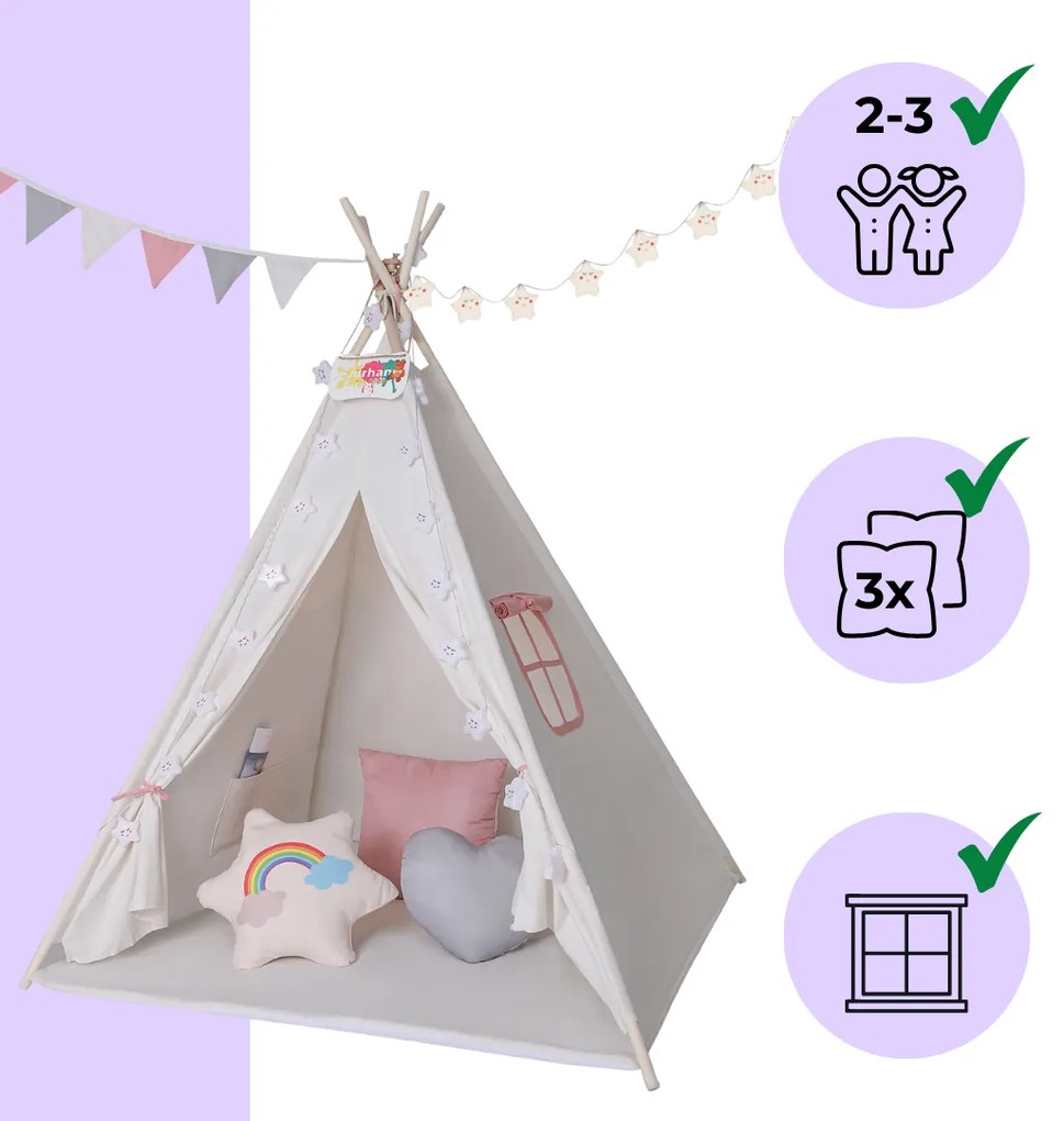 V priestrannom detskom stane od spoločnosti Spielwerk® sa plnia detské sny. Veľký detský stan ponúka priestor pre 2 až 3 deti, je univerzálny v kombinácii s ďalšími hračkami a upúta pozornosť v každej detskej izbe. Podlahová podložka má hrúbku 2,5 cm a pri hraní poskytuje veľké pohodlie. Farebne zladená girlanda a hviezdicová reťaz so smajlíkmi vytvárajú útulnú a príjemnú atmosféru. Tri farebne zladené vankúše lákajú, aby ste sa k nim pritúlili. Motívy vankúšov sú veľmi pútavé: vankúš v tvare hviezdy a dúhou, vankúš v tvare srdca a štvorcový vankúš. Každé dieťa si tak nájde ten svoj obľúbený. Okno stanu sa dá zatvoriť závesom. Dvere sa dajú zatvoriť tiež závesom na bočnej strane. Praktické popruhy udržia všetko na svojom mieste a zabezpečia optimálne súkromie. Dve veľké vnútorné vrecká ponúkajú úložný priestor na hračky. Bezpečnosť je tu prioritou vďaka zaoblenej topoľovej tyči. Stan je vybavený aj protišmykovým systémom, takže zostane bezpečne na mieste, aj keď sa deti divoko hrajú. Rohy hviezdicovej retiazky sú zaoblené. Reťaz je vyrobená z robustného nerozbitného plastu, má 20 LED svetiel a funguje na batérie. Stan je vyrobený z kvalitnej, priedušnej bavlny a je ľahký a ľahko sa prenáša. Okrem toho, keď sa stan nepoužíva alebo keď cestujete, možno ho dokonale a priestorovo úsporne uskladniť v priloženej prepravnej taške. Stan je tiež skvelým darčekom. Jednoduché zostavenie teepee stanu. Prepravná taška pre jednoduché uskladnenie. Obsahom balenia je aj farebná girlanda a hviezdičkové svetlá. Mäkká a komfortná podložka. Technické údaje: rozmery: stan (v x š x h): 160 x 120 x 120 cm podložka (d x š x v): 120 x 120 x 2,5 cm záves: 22 x 25 cm vnútorné vrecko: 15 x 20 cm vankúš hviezda s dúhou: 40 x 40 cm vankúš srdce: 30 x 30 cm vankúš štvorec: 40 x 40 cm materiál: rozprávkové svetlá: 100% plast počet vnútorných vreciek: 2 ks konštrukcia: 100% topoľové drevo stan: 100% bavlna podložka: 100 % bavlna záves: 100% bavlna vankúše: 100% polyester dĺžka svetelnej reťaze: 3 m počet LED diód: 20 ks farba: ružová, béžová záruka: 24 mesiacov