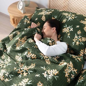 Posteľné obliečky s motívom marhuľových kvetov s lístkami vytvorí uvoľnenú atmosféru vo vašej spálni. Sú ušité zo 100% mäkčenej bavlny o gramáži 145 g/m2. Podkladom obliečok je tmavo zelená farba. Ušité s láskou našimi šičkami Každé posteľné obliečky prejdú rukami našich skúsených šičiek, ktoré ich pre vás starostlivo nastrihajú a ušijú priamo v Českej republike. Rozmery šité na mieru zadávame do výroby hneď na druhý deň po objednaní, aby ste si nový kúsok mohli užiť čo najskôr. Jednoduché zapínanie na zips Posteľné obliečky sú vybavené praktickým zapínaním na zips, vďaka ktorému bude prezliekanie periny a vankúša otázkou chvíľky. Zips je navyše schovaný v leme, takže pri spaní nie je vidieť ani cítiť.