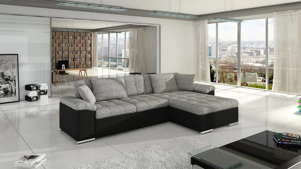 Rozkladacia rohová čalúnená sedacia súprava s úložným priestorom do tvaru L AVESTA pravá sivá