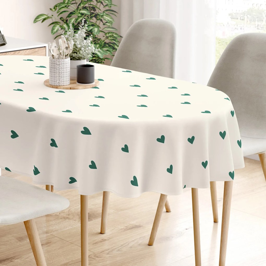 Bavlnený oválny obrus s motívom tmavo zelených srdiečok na slonovej kosti. Je vyrobený z veľmi kvalitnej 100% bavlny (gramáž 145g/m2). Obrus veľmi dobre drží tvar a hodí sa na akýkoľvek oválny stôl. Obrus s motívom tmavo zelených srdiečok dokonale skrášli Váš interiér. Tento obrus ponúkame vo väčšine štandardných rozmerov. Pokiaľ Vám požadovaný rozmer chýba, zvoľte si variantu "Ušitie na mieru" a zadajte vlastné rozmery. Krajčírky potom obrus ušijú na mieru podľa Vášho želania. Jedná sa o kvalitný český výrobok s originálnym motívom, ktorý zakúpite iba v našom internetovom obchode. Aký rozmer obrusu vybrať? Obrus by mal z každej strany presahovať okraj stola aspoň o cca 15 - 20 cm. Pokiaľ máte oválny stôl o rozmere 90 x 130 cm, odporúčame zakúpiť obrus s rozmermi minimálne 120 x 160 cm. Vždy ale záleží, kde budete obrus používať a aký presah Vám bude vyhovovať.