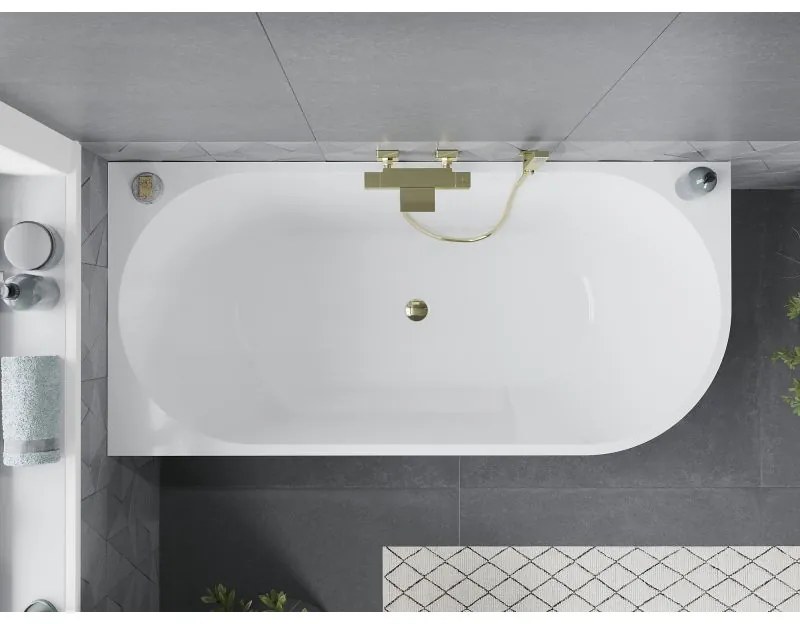 Popis výrobku: Veľkosť: 160 x 80 cm Výška: 58 cm Hĺbka: 45 cm Montáž: rohová, ľavá strana Materiál: sanitárny akrylát Farba: biela Povrchová úprava: zlatá lesklá Prepadový otvor. Áno Otvor na vaňovú batériu: Nie Súčasťou balenia je sifón a odtoková zátka typ ClickClack Odolný voči dechtovaniu a UV žiareniu