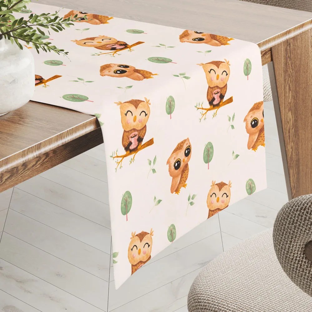 Detský behúň na jedálenský stôl s milým detským motívom sovičiek na vetvičkách na bielom podklade. Je ušitý z husto tkaného 100% bavlneného plátna s certifikátom zdravotnej nezávadnosti Oeko-Tex 100. Behúň dodávame kompletne obšitý. Dekoračné behúne Sandra sú praktickým doplnkom interiéru Vášho domu, bytu, chalupy a sú vhodné aj do hotelov a reštaurácií. Odporúčaný presah (previs) behúňa je cca 20-30 cm na každej strane stola, tzn. ak máte stôl dlhý napr. 100 cm, objednajte behúň s dĺžkou 140 až 160 cm. Šijeme v našich krajčírskych dielňach v ČR, ponúkame aj rozmery na mieru.