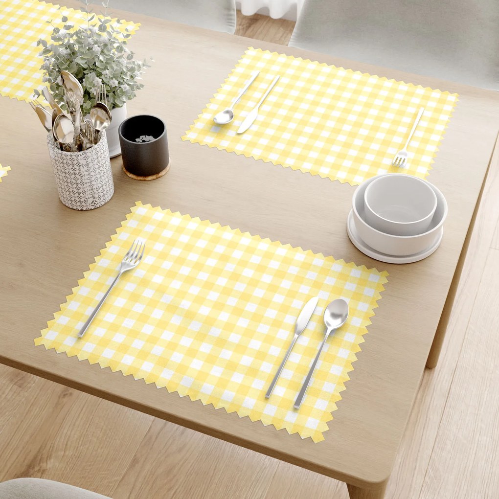 Žlté kocky doladia atmosféru záhradného posedenia, či už doma alebo na chalupe, k dokonalosti. Na váš stôl prinesú sviežosť leta a čaro vidieka. Prestieranie je vyhotovené z dekoračnej látky s teflónovou úpravou zo 100% polyesteru s gramážou 220g/m2. Vďaka teflónovej úprave vyliata tekutina nevsiakne do prestierania a zostane len na povrchu vo forme kvapiek. Prestieranie je odolné voči škvrnám - je ľahko umývateľné. Nečistoty stačí iba zotrieť vlhkou handričkou. Prestieranie je veľmi praktickým a moderným doplnkom jedálenského stola. Tieto prestierania ponúkame v rozmere 30 x 40 cm. Balenie obsahuje 2 kusy prestierania, preto ak potrebujete zakúpiť celkom 4 prestierania, musíte si zakúpiť dve tieto sady (do nákupného košíka vložte 2 ks). Jedná sa o kvalitný český výrobok s károvaným motívom, ktorý zakúpite iba v našom internetovom obchode.