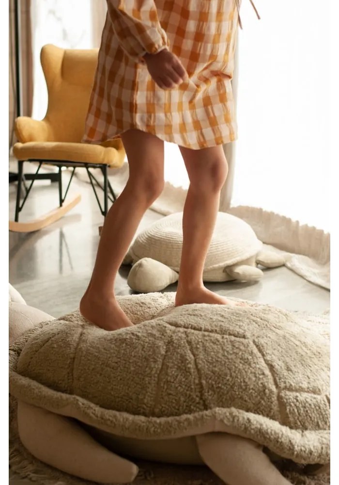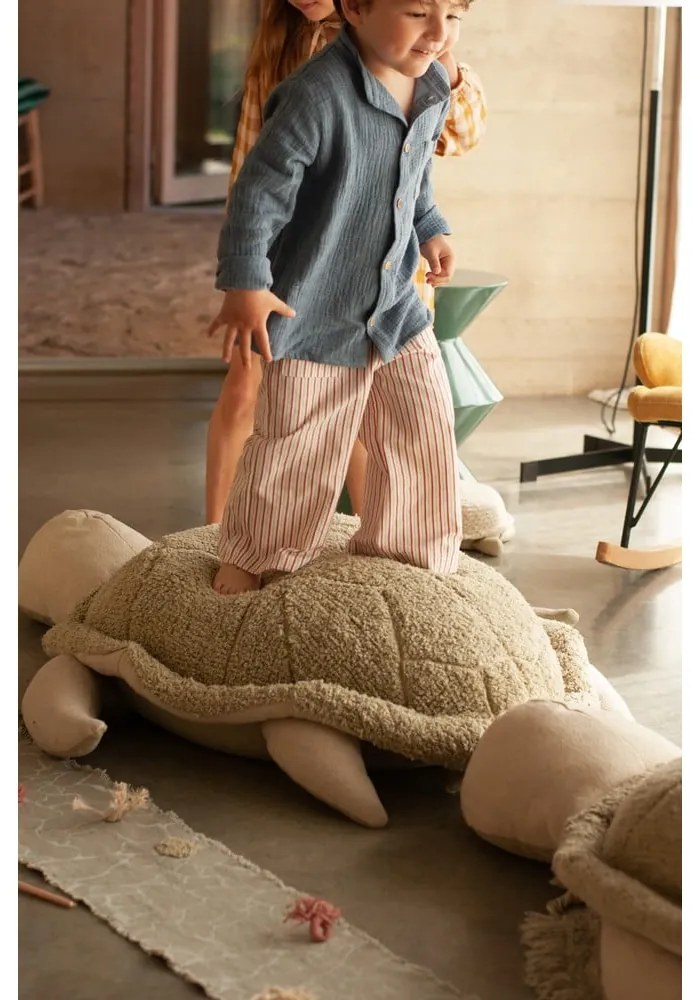 Tento detský taburet značky Lorena Canals je rozkošný a funkčný doplnok do každej izby. Má „pancier“ z mäkkého olivovozeleného bavlneného vlasu s prepracovaným symetrickým vzorom, zatiaľ čo labky, hlavu a chvostík, rovnako tak ako celú spodnú časť tvorí plátno. Taburet sa veľmi ľahko udržuje – vďaka zipsu na spodnej strane je možné výplň vybrať a povlak vyprať. Hlavná časť taburetu je naplnená polystyrénovými guličkami pre pohodlné sedenie, zatiaľ čo hlava a labky obsahujú mäkkú polyfillovú výplň. Ideálne na hranie, odpočinok alebo ako originálne dekorácie.