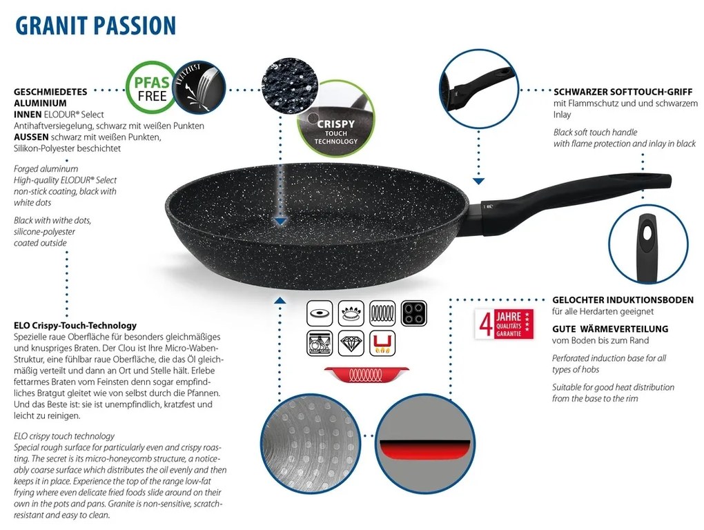 Sada panvíc Granit Passion od nemeckej značky ELO je perfektnou voľbou pre každodenné varenie a vyprážanie bez zbytočného tuku. Panvice s priemerom 20 a 28 cm sú vyrobené z vysoko odolného kovaného hliníka, ktorý zaisťuje rýchle a rovnomerné rozloženie tepla. Inovatívna mikrovoštinová štruktúra na vnútornej strane prispieva k rovnomernému rozloženiu oleja a vytvára chrumkavú textúru pokrmov.Vnútorná povrchová úprava ELODUR® Select bez PFAS na minerálno-keramickej báze je navrhnutá pre zdravé varenie s minimom tuku a zároveň poskytuje vysokú odolnosť proti poškriabaniu. Hrubšia štruktúra pomáha ľahkému uvoľneniu pokrmu a výrazne uľahčuje čistenie. Moderný čierny vzhľad s jemnými bielymi bodkami dodáva panvici atraktívny vzhľad a ladí s akýmkoľvek štýlom kuchyne.Panvice sú vybavené ergonomickými rukoväťami Soft-touch s ochranou proti plameňu a dierovaným indukčným dnom, ktoré umožňuje použitie na všetkých typoch varných dosiek vrátane indukčných. Sú vhodné aj do umývačky riadu a majú zvýšenú životnosť vďaka pevnej konštrukcii. Výrobca poskytuje predĺženú záruku 48 mesiacov, ktorá potvrdzuje kvalitu a spoľahlivosť výrobku.Hlavné výhody produktu: inovatívny nepriľnavý povrch ELODUR® Select bez PFAS mikrovoštinová štruktúra pre perfektné rozloženie oleja odolnosť proti poškriabaniu a vysokým teplotám ergonomická Soft-touch rukoväť s ochranou proti plameni kovaný hliník pre rýchle a rovnomerné zahrievanie vhodné pre všetky typy varných dosiek vrátane indukčných ľahké čistenie a údržba, vhodné do umývačky riadu moderný dizajn s dlhou životnosťou predĺžená záruka 4 rokyObsah balenia: 1x pan Granit Passion Ø 20 cm 1x panvica Granit Passion Ø 28 cm