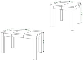 FONTE je perfektný stôl pre ľudí, ktorí majú radi klasické riešenia. Vďaka jednej 45 cm vložke je možné jeho dosku predĺžiť na 130 cm - je to veľmi jednoduché vďaka použitiu kvalitných synchrónnych vodítok. Tento stôl sa bude skvele hodiť na rôzne malé rodinné akcie alebo stretnutia s priateľmi a navyše poteší oko svojim tradičným, no zároveň estetickým vzhľadom. DODATOČNÉ INFORMÁCIE Doska stola je vyrobená z vysoko kvalitnej obojstranne laminovanej matnej drevotrieskovej dosky s hrúbkou 2,8 cm, zakončenej 1 mm ABS hranou. Nohy sú vyrobené z dosky silnej 5,4 cm, ostatné prvky sú vyrobené z dosky silnej 1,8 cm. DÔLEŽITÉ: Zväčšovacia vložka je umiestnená v špeciálnej priehradke pod doskou stola, vďaka čomu je pri rozkladaní stola vždy po ruke a nemusíte ju skladovať samostatne. Rozmery a hmotnosti balíkov: 1. 85 x 49 x 14 cm (30 kg) 2. 73 x 48 x 7,5 cm (13 kg)