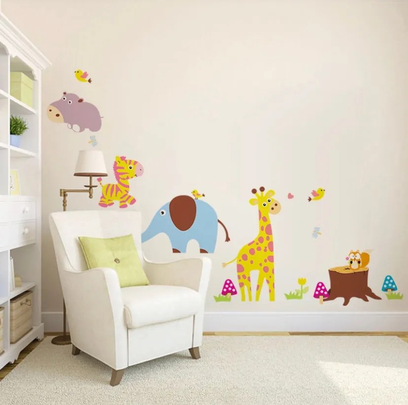 Pestrofarebná dekoračná samolepka ideálna pre menšie deti ktoré sa učia spoznávať zvieratka. Samolepka sa skladá z 5 zvieratiek a z doplnkových samolepiek (vtáčiky, hríby a vážky) . Každá samolepka sa lepí samostatne. Lepí sa ako obyčajná samolepka. Je vodou umývateľná. Rozmer balenia: 60 x 90 cm Finálny dizajn a rozmer samolepky je iba na vás. Môžete si ju nalepiť podľa predlohy ( 58 x 235 cm ), podľa vlastnej fantázie alebo jednotlivé časti nalepiť na rôzne miesta. Materiál: PVC Samolepka najlepšie drží na hladkom povrchu, napríklad nábytok, ale môže sa lepiť aj na stenu so stredne hrubou omietkou, ktorá sa neolupuje a neopadáva.