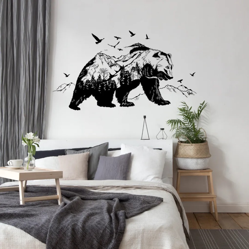 Samolepka sa skladá z veľkej samolepky medveďa, ktorý je zároveň aj lesom a pohorím. Doplnená je o lietajúce vtáky. Každá samolepka sa lepí samostatne. Lepí sa ako obýčajná samolepka. Je vodou umývateľná. Rozmer balenia: 60x90cm Finálny rozmer samolepky: 68x122cm Materiál: PVC Samolepka najlepšie drží na hladkom povrchu, napríklad nábytok, ale môže sa lepiť aj na stenu so stredne hrubou omietkou, ktorá sa neolupuje a neopadáva.