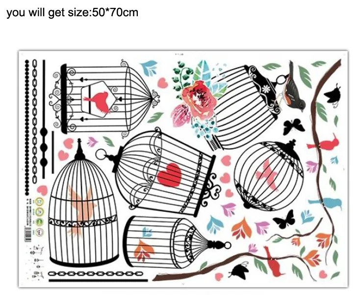Samolepka sa skladá zo 6 klietok a množstva doplnkových samolepiek (motýle, vtáky, lístky a kvety). Každá samolepka sa lepí samostatne. Lepí sa ako obyčajná samolepka. Je vodou umývateľná. Rozmer balenia: 50 x 70 cm Finálny dizajn a rozmer samolepky je iba na vás. Môžete si ju nalepiť podľa predlohy ( 96 x 190 cm ), podľa vlastnej fantázie alebo jednotlivé časti nalepiť na rôzne miesta. Materiál: PVC Samolepka najlepšie drží na hladkom povrchu, napríklad nábytok, ale môže sa lepiť aj na stenu so stredne hrubou omietkou, ktorá sa neolupuje a neopadáva.