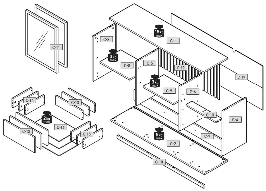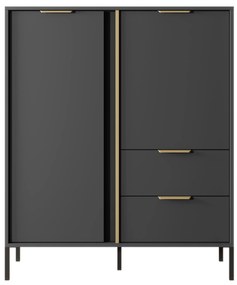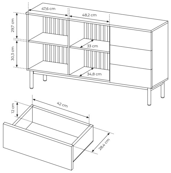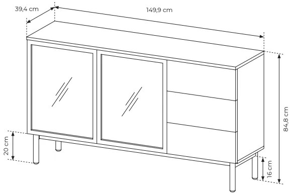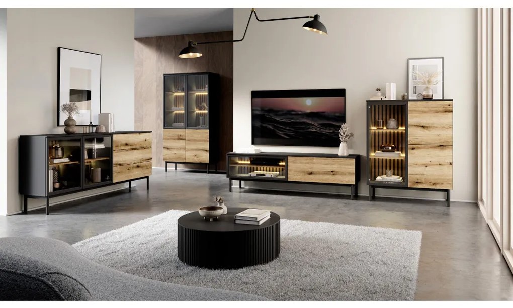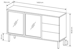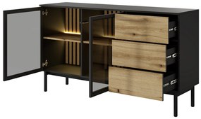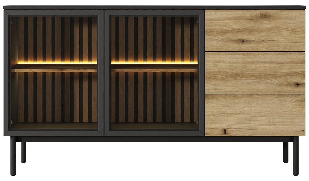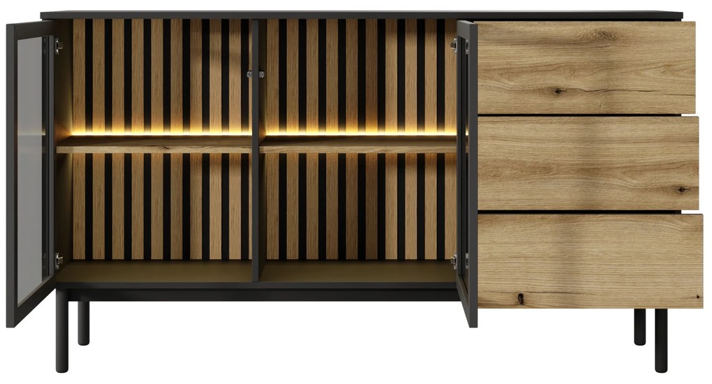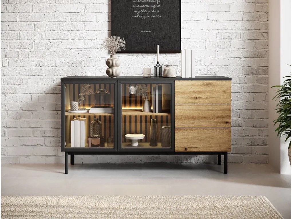 Komoda Lang C Komoda Lang C má kombináciu zásuviek a políc. Na pravej strane má 3 priestranné zásuvky vo farbe dubu evoke . Väčšiu časť komody tvorí presklená časť, ktorá má v sebe 2 podsvietené police. Komoda je v strede presklenej časti predelená stredovou priečkou, čo dodáva nábytku väčšiu stabilitu. Komoda Lang C je postavená na vysokých drevených nožičkách v čiernej farbe . Korpus komody je z laminovanej drevotriesky , ktorá je ohranená ABS páskou a dvierka sú z MDF materiálu . Sklo na ľavej strane je tvrdené. Na nábytku je použité elegantné otváranie pomocou systému PUSH TO OPEN . Zásuvky sú s plným výsuvom na guličkových koľajniciach. Detaily o komode Materiál : laminovaná drevotrieska, MDF doska, sklo. Farba : čierna / dub evoke. ABS hrany. Otváranie bez úchytiek - systém PUSH TO OPEN. Počet políc: 2 Počet dvierok: 2 Počet zásuviek: 3 Nosnosť: 32 kg