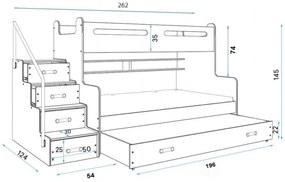 Poschodová posteľ MAX 3 aj s dodatočnou prístelkou v šuflíku (výsuvné tretie lôžko) Rozšírená poschodová posteľ s prístelkou MAX 3 so schodíkmi prichádza na novej platformej a je ešte majestátnejšia ako predtým! Dodatočné schodíky so zábradlím majú v jednotlivých schodoch integrované vyťahovacie šuflíky. Navyše prístelka na kolieskach s úložným priestorom a dve poličky v medzipriestore robia z tejto postele ultimátnu detskú stanicu. Vaše deti je budú milovať, pre jej variabilitu, funkčnosť a možnosti či už na hranie ale v prvom rade na spanie. Max 3 prichádza v piatich farebných variantách a teraz už s dizajnovými uchytkami (oproti starému modelu ktorý mal iba vyfrézované zapustenia na ruku) Poschodová posteľ s prístelkou MAX 3 so stabilnou konštrukciou a úložným priestorom pre 3 osoby. Vyrobená z kvalitnej MDF a LTD dosky. Prispôsobené pre matrac veľkosti 200x120 cm a 200x80 cm (prístelka rozmeru 190x80 cm) Chcete schodíky vľavo alebo vpravo? Zákazník si sám počas montáže rozhodne na ktorú stranu dá schodíky. Poschodovka MAX 3 má v prístelke, ktorá je výsuvná na štyroch kolieskach, spodný odkladací priestor výšky cca 10cm pod matracom a roštom prístelky, ktorý môžete využiť na posteľnú bielizeň, prípadne hračky Vášho dieťaťa (do odkladacieho priestoru sa dostanete "z vrchu" prístelky). Schodíky sú odmontovateľné v prípade potreby. Stabilná konštrukcia zaručuje bezpečnosť a pohodlie pre Vaše dieťa. Zaoblené hrany a rohy sú samozrejmosťou, ktorá prispieva k ochrane Vašich detí. Montáž je jednoduchá a zvládne ju naozaj každý. (potrebné 2 osoby) CENA ZAHŔŇA: - Poschodová posteľ MAX 3 /rám postele/ - MDF/LTD konštrukcia (200x120cm / 200x80cm) - rošty postele z flex lamiel v plastových púzdrach (200x120cm / 200x80cm , prístelka rošt 190x80cm) - prístelka v spodnej zásuvke o rozmere 190x80cm + v prístelke ešte úložný priestor o výške cca 10cm - 3x penové(molitanové) matrace s poťahom (prepierateľné) - 2x odkladacie poličky v medzipriestore integrované do zadnej steny postele MAX 3 - dodatočné schodíky so zábradlím pre ešte väčšiu bezpečnosť + v každom schode je integrovaná zásuvka o rovnakej dĺžke ROZMERY Posteľ: Rozmer v pôdoryse: Dĺžka celkom: 262 cm - Šírka celkom: 124 cm Výška celkom: 145 cm Ostatné rozmery: viď. obrázok č.2 Matrace: matrace Rozmery: 200 cm x 80 cm x 9 cm, 200 cm x 120 cm x 9 cm, prístelka 190cm x 80cm x 7cm Materiál: Molitánová pena PUR Poťah: Snímateľný na zips Poznámka: - farebné odtiene masívu alebo MDF/LTD dosky sa môžu líšiť od skutočnosti v závislosti od Vášho typu monitora, tiež svetelných podmienok pri fotení produktu, alebo digitálnej úpravy produktu
