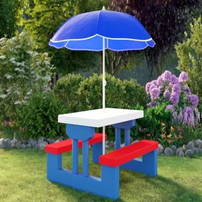 Detský plastový piknikový set Stôl s dvoma lavicami a pripevnený slnečník - umývateľný - Ľahko sa čistí - jednoduchá montáž a demontáž špecifikácie: - Rozmery stola: dĺžka: 67 cm x šírka 41 cm x výška: 47 cm - Rozmery lavice: dĺžka: 67 cm x šírka: 15,5 cm x výška: 24 cm - Nie je vhodné pre deti do 36 mesiacov - Materiál slnečníka: 100% polyester