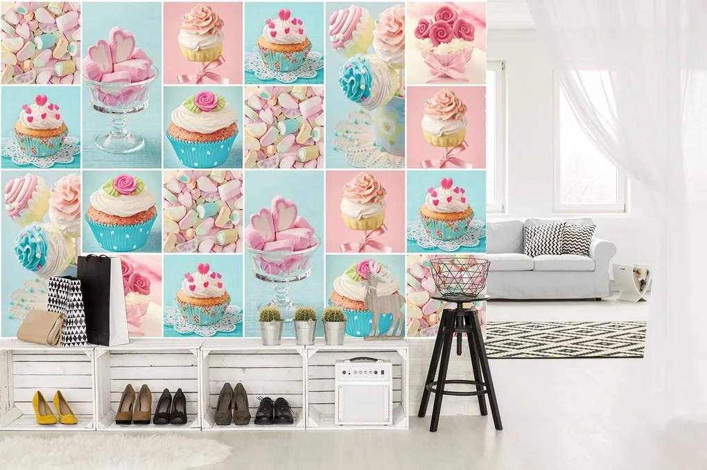 Fototapeta - Farebné košíčky a marshmallows (254x184 cm)